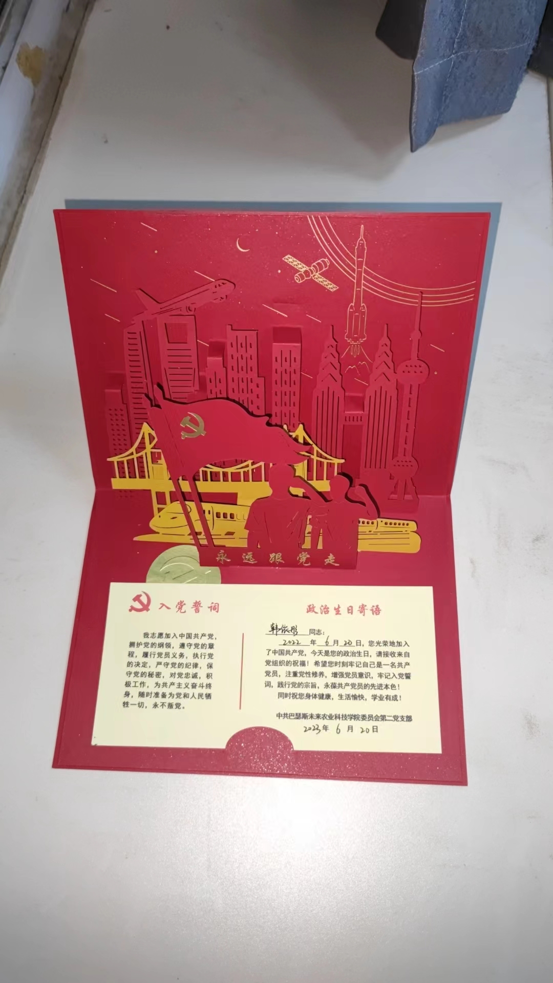 活动伊始,刘焕奇、刘璐首先向公司第一批转正的党员致以祝贺,肯定了大家在党组织考察期间的良好表现。随后,各名党员围绕自己近一年的表现,在思想政治、学业工作、品德修养等方面做了汇报,大家纷纷讲述了自己一年来的收获与成长,阐述了对党的最新认识与理解,分享了对党章党规、习近平总书记重要讲话的学习心得。刘焕奇为转正党员颁发贺卡,贺卡采用镂空的样式,精心设计的图案寓意国家社会主义现代化建设的伟大成就,跃然纸上的青年形象象征着国家未来发展的蓬勃力量,传递了对青年党员的殷殷希望。