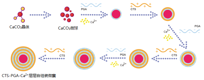 具体来讲,针对常规果柄补钙技术成本高,无法大规模推广的瓶颈问题,实践团研发制备壳聚糖(CTS)-海藻酸钠-CaCO3与壳聚糖-海藻酸钙-IAA-ABA层层自组装微囊,并将双微囊分散于超保水壳聚糖温敏凝胶中,制备得到含有双微囊的复合凝胶体系。利用凝胶的温敏性能,将双微囊控释体系使用工艺与苹果纸袋一次成型过程相结合,简化制备及使用流程,实现果柄部位凝胶覆盖与套袋流程一体化。通过在精确时间点对果柄处吸附的复合凝胶喷洒柠檬酸/柠檬酸钠溶液,对壳聚糖(CTS)-海藻酸钠-CaCO3层层自组装微囊中的CaCO3沉淀进行酸溶处理,对壳聚糖-海藻酸钙-IAA-ABA层层自组装微囊中的海藻酸钙进行Na/Ca置换,促进微囊溶胀,从而同时实现Ca2+、IAA及ABA的精确释放,有效解决了果实生长过程中果柄对Ca2+、IAA及ABA的有效吸收问题,原理示意图如图1所示。另外,我们采用IAA和ABA两种植物激素共同作用,利用层层自组装微囊包裹和海藻酸的Na+/Ca2+置换方法,实现对IAA和ABA的长期稳定存储及在补钙高峰期与Ca2+同步的定点定向释放,从而解决苹果果实内Ca2+吸收后的再分配问题。而且,我们开发的套袋苹果果柄补钙凝胶产品巧妙地利用了壳聚糖温敏凝胶体系低温流动、高温成胶且成型后形态不具有可逆性的性质,在低温下将流动态凝胶涂抹于纸袋内侧,后提高温度,实现固态凝固,在纸袋加工过程中即可完成此工序,为实现果柄补钙大规模应用提供了关键的技术支持。