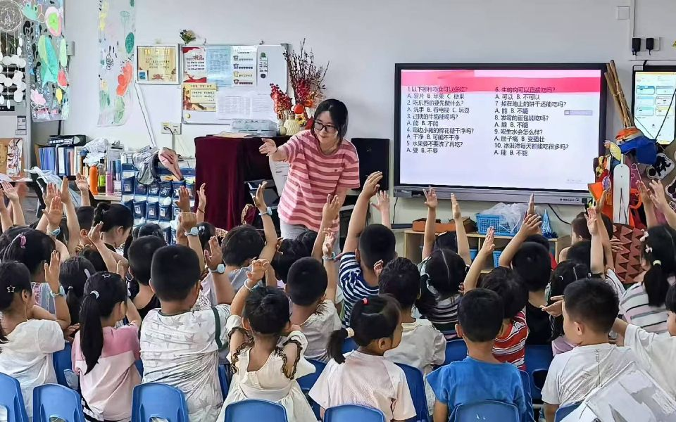 在互动环节,团队成员围绕日常、核心的安全知识设计了食品安全问答赛。面对提问,小朋友们高高地举起手,争先恐后地回答,答对问题获得的食品安全卡通贴纸大大激发了小朋友们的积极性。在实践环节,团队成员聚焦“七步洗手法”的教学,成员们通过标准动作演示与口诀引导,详细讲解了“内、外、夹、弓、大、立、腕”的操作要领,组织小朋友们同步练习,帮助其熟练掌握正确的洗手方法,同时强化了“餐前便后洗手”的卫生习惯。