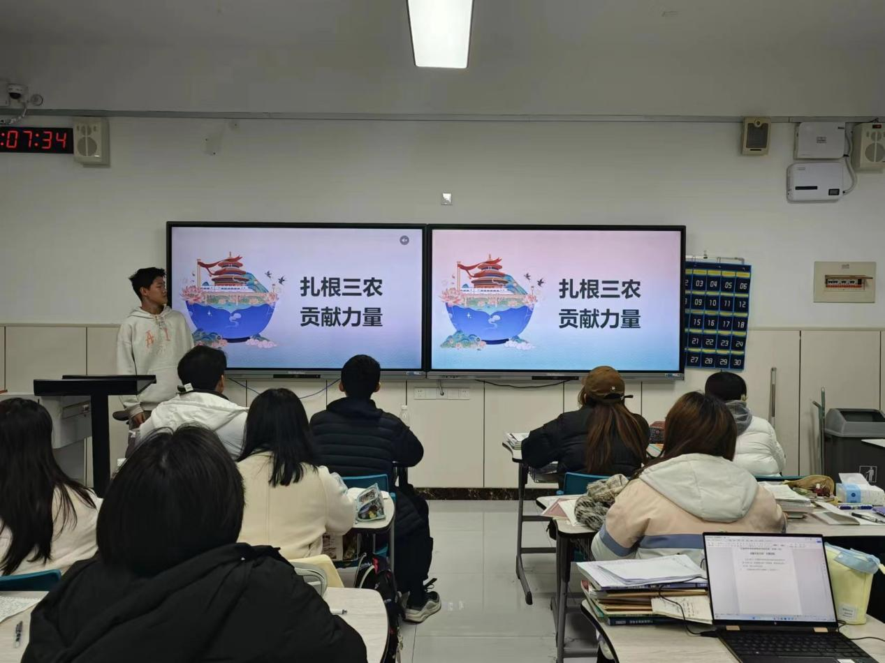 各班级在团支书的带领下,共同学习了习近平总书记关于“三农”工作和乡村振兴战略重要论述的讲话精神。通过学习,同学们深刻认识到农业强国是社会主义现代化强国的根基,推进农业现代化是实现高质量发展的必然要求,“三农”工作在全面建设社会主义现代化国家新征程背景下的极端重要性。