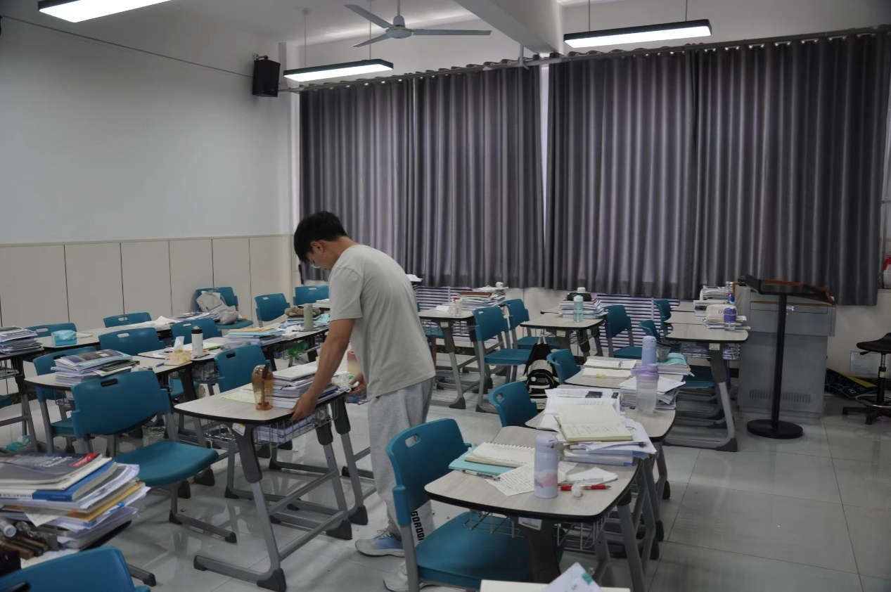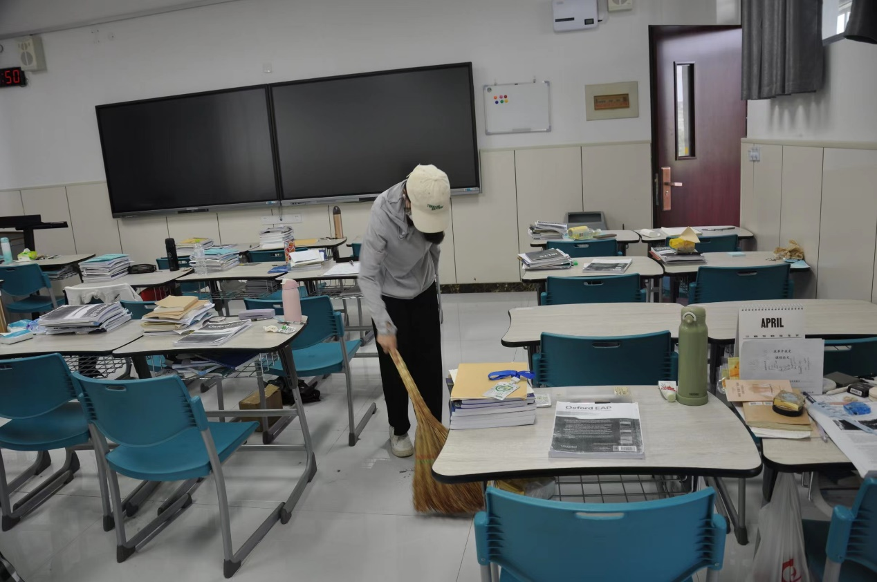 中午11:45,志愿者在预定教室准时集合,按照分配好的任务,开展清洁工作。劳动过程中,志愿者们分工明确,积极行动。大家手拿扫帚、拖把穿梭于各个教室之间,归整参差的桌椅,擦拭积灰的窗台,清理角落里堆积的垃圾,所到之处,门窗洁净、桌凳整齐、玻璃透亮、廊道无尘,g楼在志愿者的打扫下焕然一新。