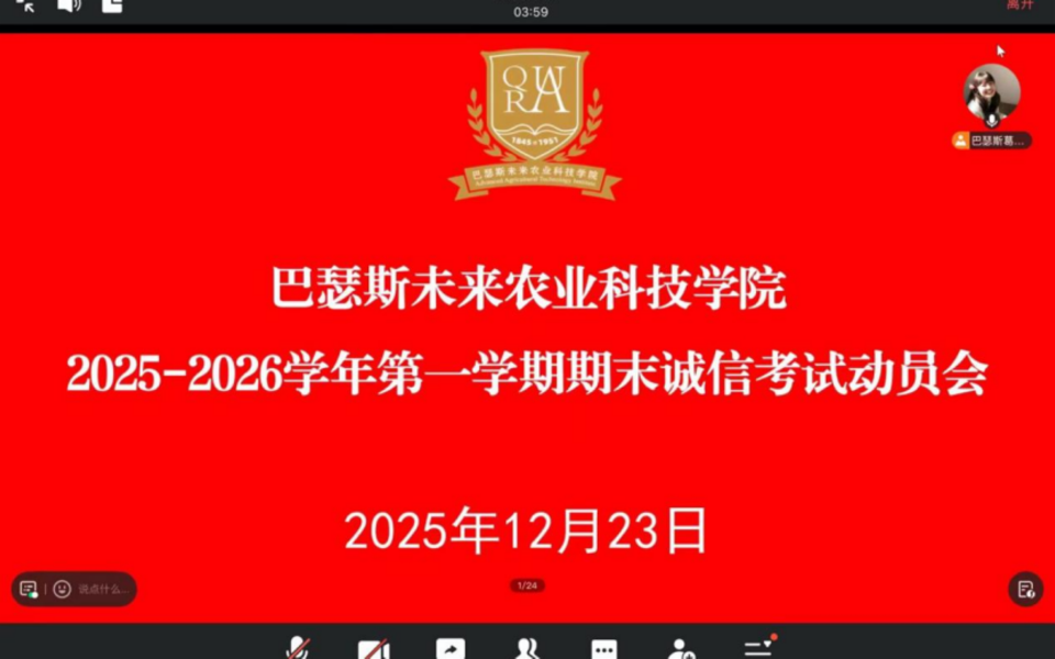 为强化优良考风考纪,12月22日至23日,bw西汉姆联在学术会馆第二报告厅和线上平台召开2025年期末诚信考试动员大会。会议由公司辅导员葛得铭主持,经理刘焕奇出席并讲话。英国皇家农业大学中国中心专员李迎、公司全体员工参会。