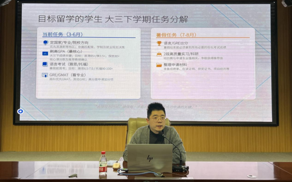 随后,张元龙围绕留学申请与升学规划展开专题分享。他从留学国家选择、申请条件、时间安排等方面进行了细致讲解,重点介绍了英国、澳大利亚、中国香港、新加坡等热门地区的升学优势,结合真实案例,针对语言备考、院校申报、材料筹备等关键环节给出实操性建议,帮助同学们理清留学申请流程,强化主动规划意识。